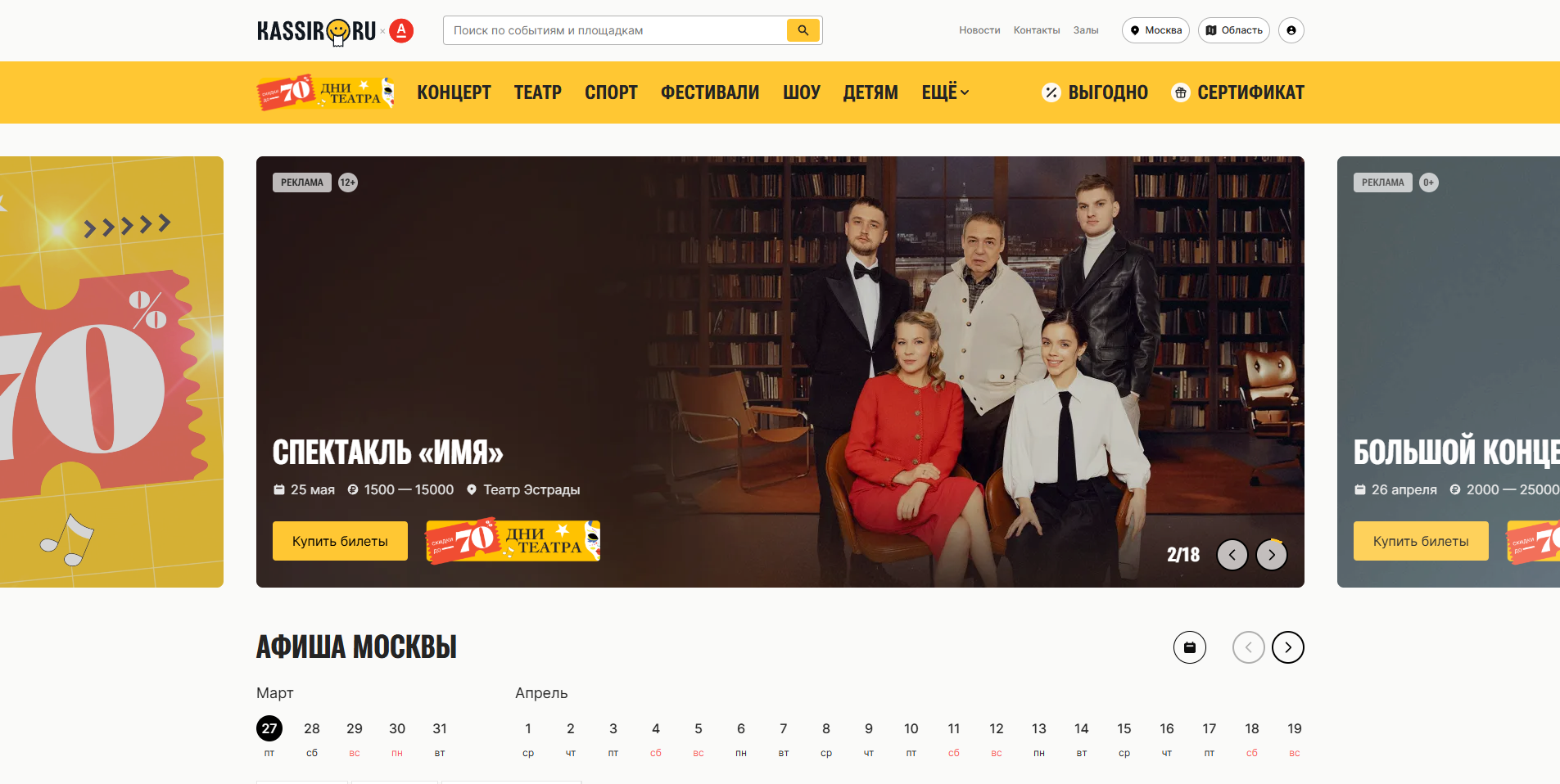 Кассир — один из крупнейших билетных операторов в России, предлагающий удобный онлайн-сервис для поиска и покупки билетов на мероприятия. Платформа объединяет афиши концертов, театральных постановок, спортивных матчей и фестивалей в разных городах страны.