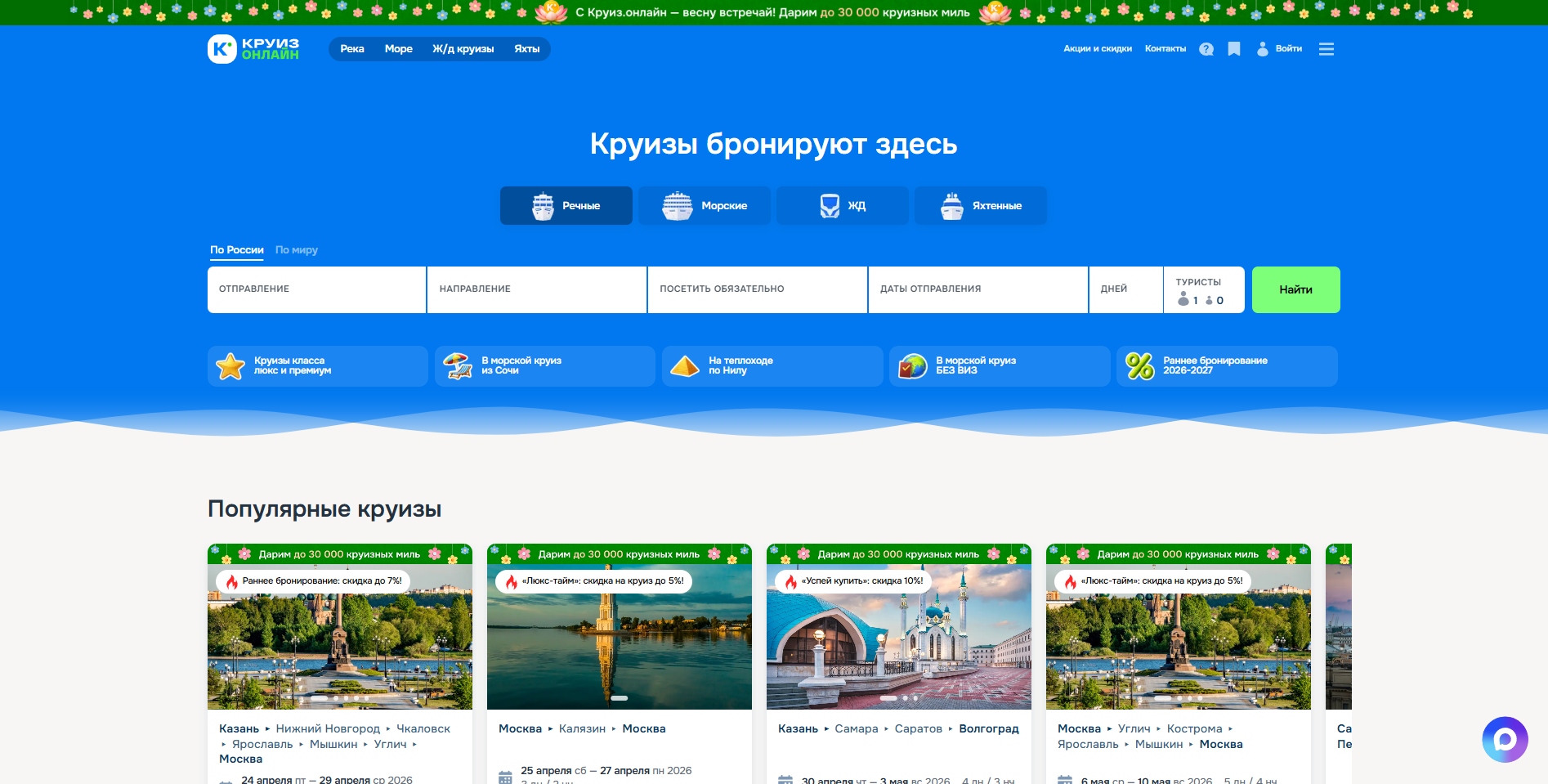 На сервисе встречаются ярко выраженные сезонные акции: предложения к старту навигации, специальные подборки к 23 февраля и 8 марта, раннее бронирование на новый сезон.