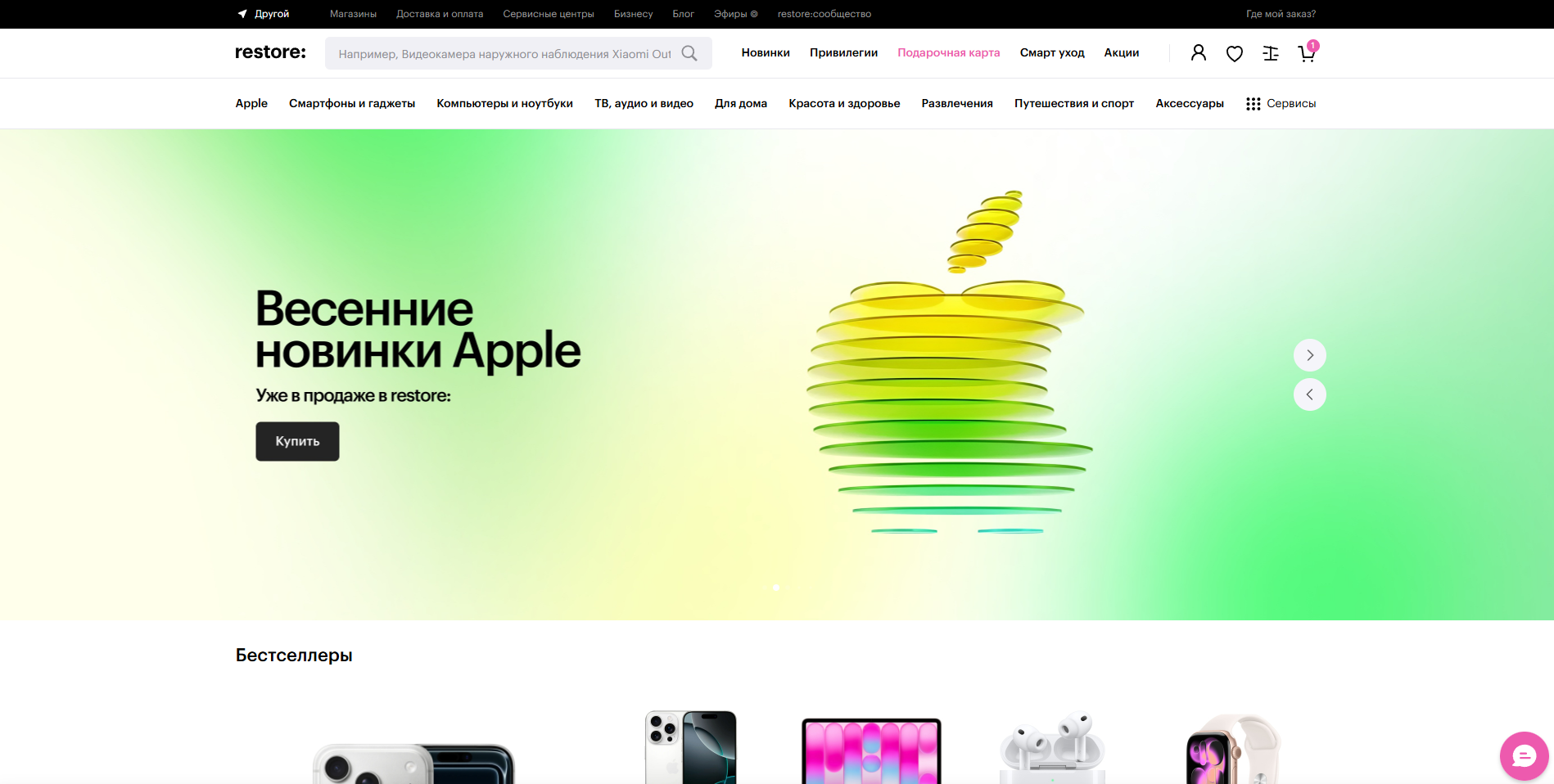 Рестор — крупная российская сеть магазинов электроники. История бренда началась в 2005 году: первый магазин Apple Center открылся в Москве, а позднее сеть выросла в заметного игрока на рынке премиальной электроники. Сегодня restore развивает не только интернет-магазин, но и розничное направление, делая ставку на оригинальную продукцию, консультации и сервисное сопровождение покупателей.