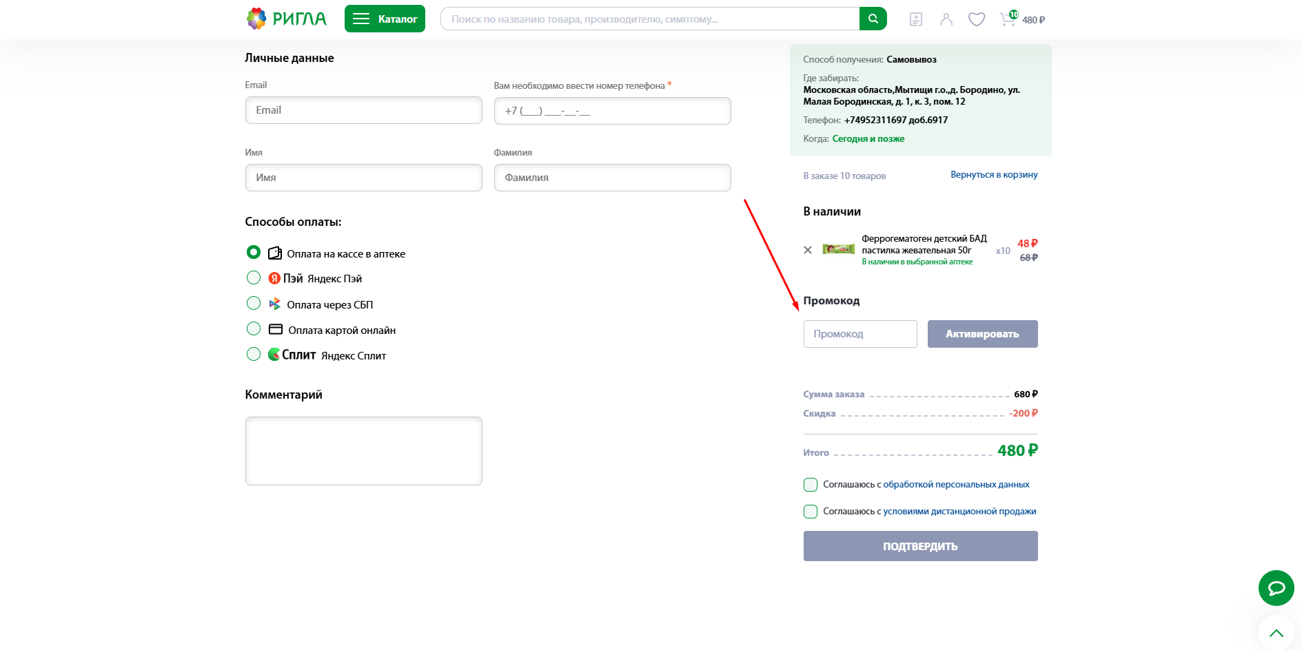 При оформлении заказа найдите поле для ввода промокода.