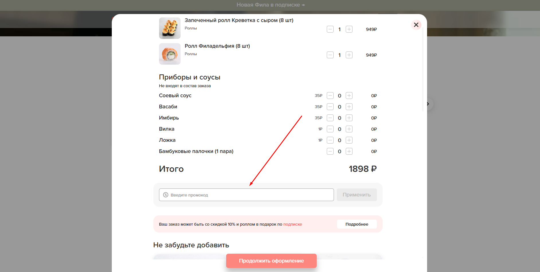 Найдите поле для ввода промокода.